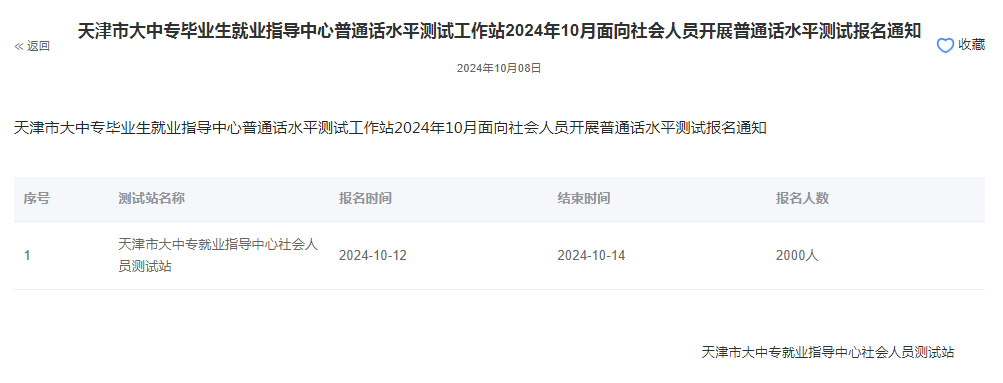 天津商务职业学院2024年普通话报名时间:2024年10月15日