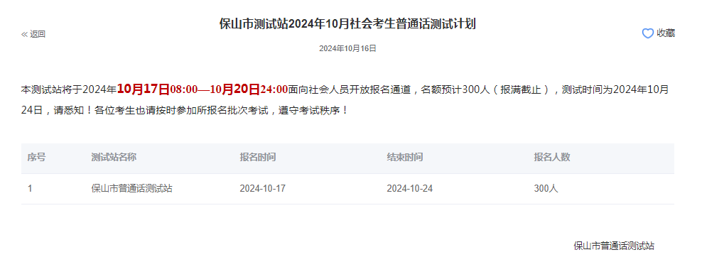 保山学院2024年普通话报名时间是2024年11月17日,报名网站是国家普通话水平测试在线报名系统(https://bm.cltt.org/),考生可登录国家普通话水平测试在线报名系统自行报名。