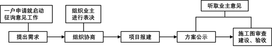 ④施工建设听取业主意见→施工单位向居民会议汇报工作