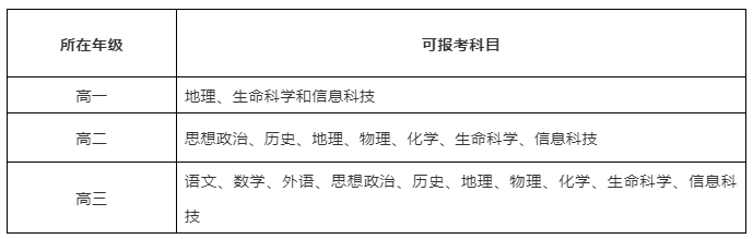 本市普通高中在籍学生可报考的合格性考试科目如下表所示: