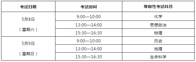 思想政治、历史、地理、物理、化学、生命科学6门科目分合格性和等级性考试,考试时间均为60分钟;其中,物理、化学和生命科学3门科目合格性考试另设技能操作测试,测试时间均为15分钟。2021年5月的等级考和6月的合格考以笔试形式进行。为不断推进高中学业水平合格性考试题库建设,探索合格考机考,在试测等值研究基础上,2021年1月16日至17日的化学、思想政治、物理、历史、地理、生命科学6门科目将试行机考,各科考试时间均为60分钟。各区教育行政部门要根据相关工作要求,做好各项准备工作,确保考试平稳有序开展。