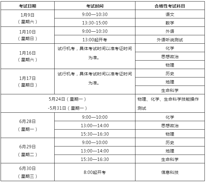 信息科技仅设合格性考试,以上机考试形式进行,考试时间为60分钟。各科目考试满分为100分。其中外语笔试满分为80分,听说测试满分为20分。