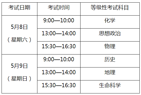 5月等级性考试设思想政治、历史、地理、物理、化学、生命科学6门科目。考生可根据高校招生要求和自身兴趣特长,在6门等级性考试科目中自主选择3门参加考试。