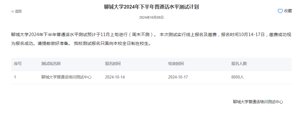 聊城职业技术学院2024年普通话报名时间:2024年9月25日